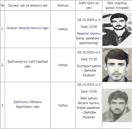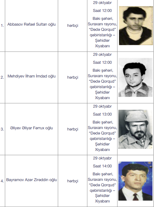 Bildirilib ki, oktyabrın 28-i saat 12:00-da Abdulla Novruz oğlu Quliyev Abşeron rayonu, Saray qəsəbəsi qəbiristanlığında, saat 12:30-da Lətif Qəribalı oğlu Şahhüseynov Sumqayıtda yerləşən Şəhidlər xiyabanında, saat 13:00-da isə Mübariz Ağahüseyn oğlu Şahmurov Bakı şəhəri, Nizami rayonu, Keşlə qəsəbəsində yerləşən Şəhidlər xiyabanında, həmçinin oktyabrın 29-u saat 12:00-da Rəfael Sultan oğlu Abbasov və İlham İmdad oğlu Mehdiyev, saat 13:00-da Əliyar Fərrux oğlu Əliyev, saat 14:00-da isə Azər Zirəddin oğlu Bayramov Bakı şəhəri, Suraxanı rayonu, “Dədə Qorqud” qəbiristanlığı-Şəhidlər xiyabanında torpağa tapşırılacaq.