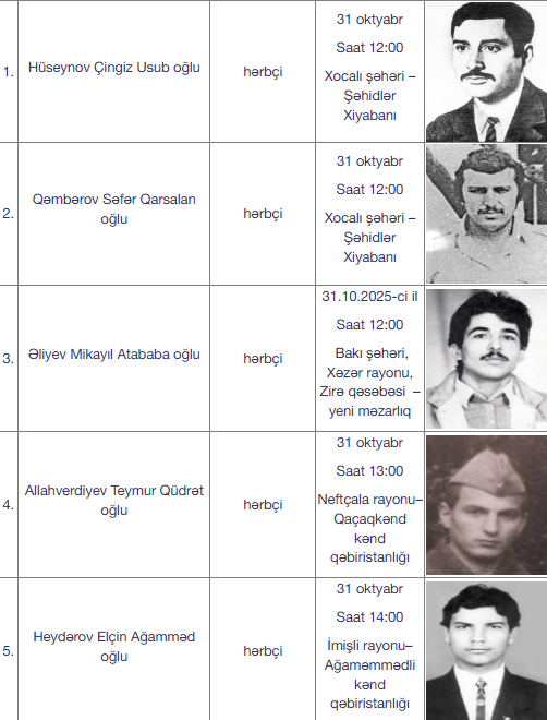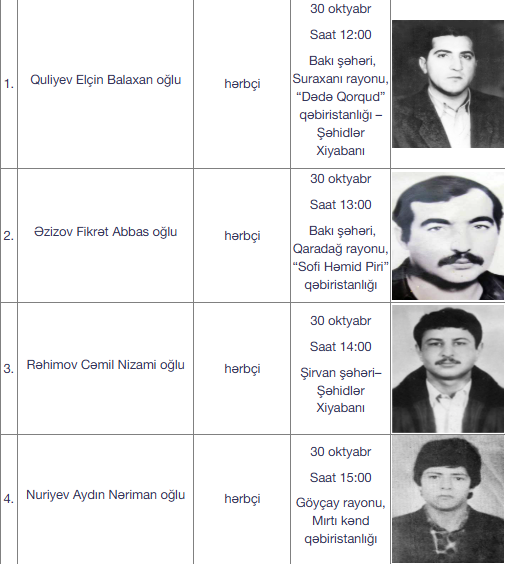 Qeyd olunub ki, oktyabrın 30-u saat 12:00-da Elçin Balaxan oğlu Quliyev Bakı şəhəri, Suraxanı rayonu, “Dədə Qorqud” qəbiristanlığı-Şəhidlər Xiyabanında, saat 13:00-da Fikrət Abbas oğlu Əzizov Bakı şəhəri, Qaradağ rayonu, “Sofi Həmid Piri” qəbiristanlığında, saat 14:00-da Cəmil Nizami oğlu Rəhimov Şirvan şəhəri Şəhidlər Xiyabanında, saat 15:00-da Aydın Nəriman oğlu Nuriyev Göyçay rayonu, Mırtı kənd qəbiristanlığında, həmçinin oktyabrın 31-i saat 12:00-da isə Çingiz Usub oğlu Hüseynov və Səfər Qarsalan oğlu Qəmbərov Xocalı şəhəri – Şəhidlər Xiyabanında, həmçinin Mikayıl Atababa oğlu Əliyev Bakı şəhəri, Xəzər rayonu, Zirə qəsəbəsindəki yeni məzarlıqda, saat 13:00-da Teymur Qüdrət oğlu Allahverdiyev Neftçala rayonu Qaçaqkənd kənd qəbiristanlığında, saat 14:00-da isə Elçin Ağamməd oğlu Heydərov İmişli rayonu Ağaməmmədli kənd qəbiristanlığında dəfn ediləcək.
