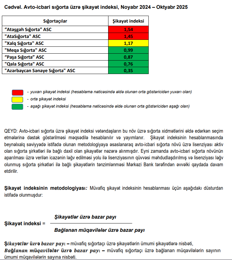 “Xalq Sığorta” isə 1.17 indeksi ilə siyahıda üçüncü olub. Digər sığorta şirkətləri üzrə şikayət indeksi aşağıdakı kimidir: