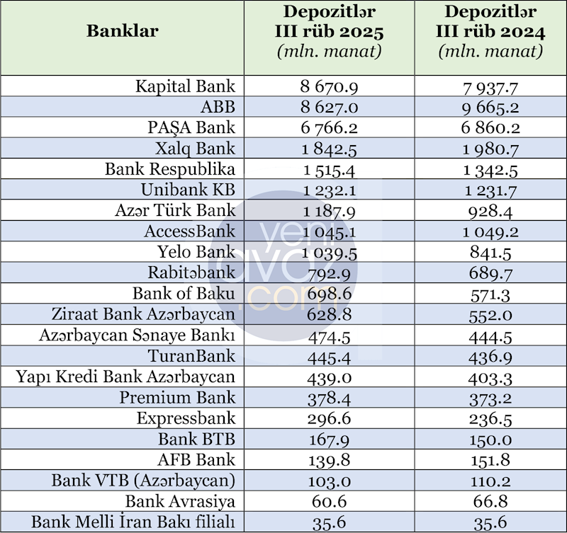 Cədvəldə bankların son 2 ilin ilk 3 rübündəki depozit portfeli əks olunub: