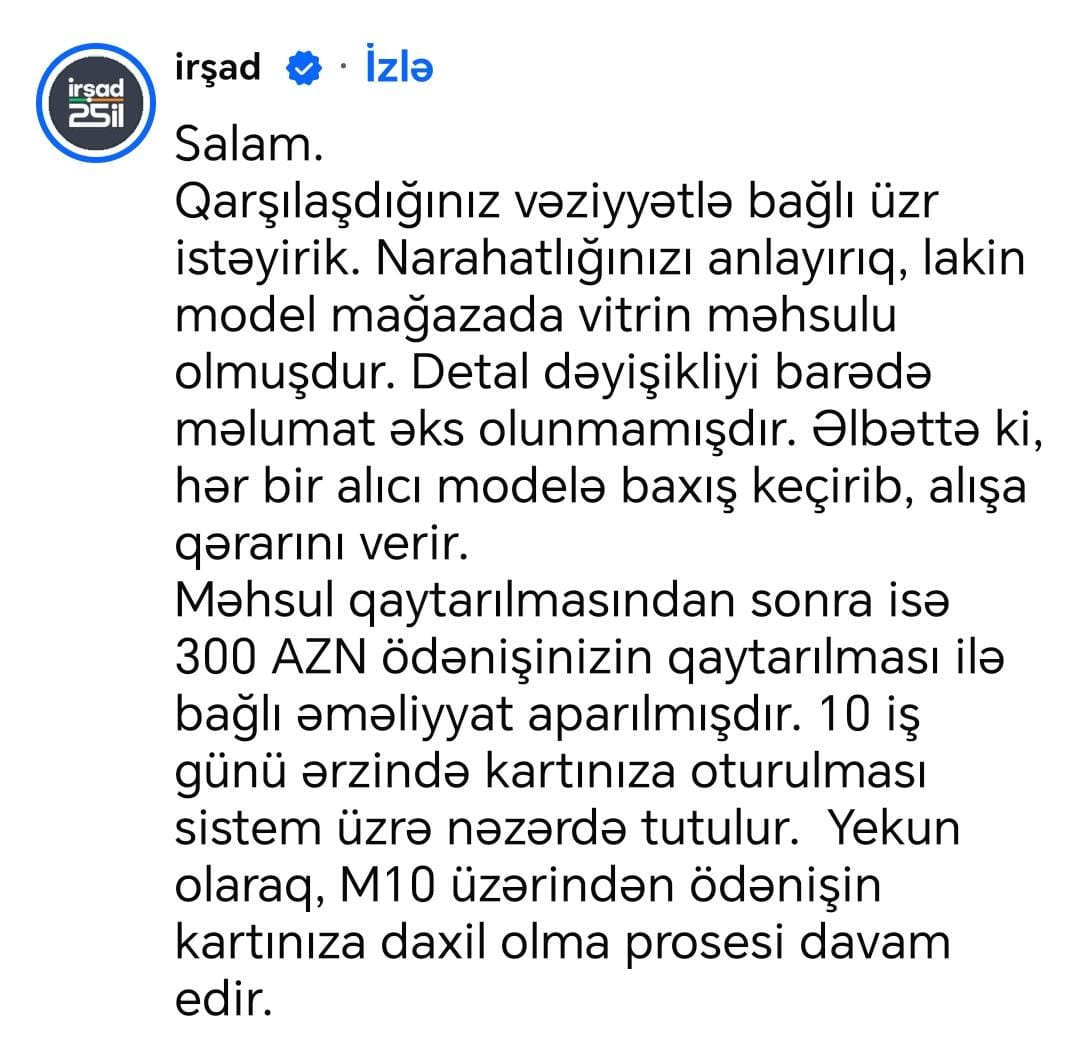 “Qarşılaşdığınız vəziyyətlə bağlı üzr istəyirik. Narahatlığınızı anlayırıq, lakin model mağazada vitrin məhsulu olmuşdur. Detal dəyişikliyi barədə məlumat əks olunmamışdır. Əlbəttə ki, hər bir alıcı modelə baxış keçirib, alış qərarını verir.