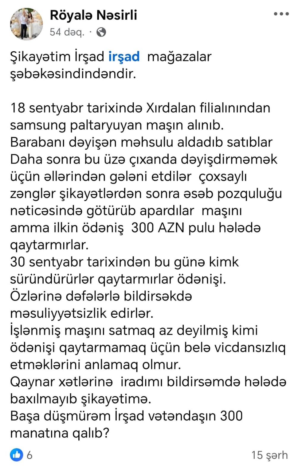 “18 sentyabr tarixində “İrşad Elektronik”sin Xırdalan filialınından Samsung paltaryuyan maşın alınıb. Barabanı dəyişən məhsulu aldadıb satıblar bizə. Bu üzə çıxanda dəyişdirməmək üçün əllərindən gələni etdilər. Çoxsaylı zənglər, şikayətlərdən sonra əsəb pozuntusu nəticəsində götürüb apardılar maşını, amma indi də ilkin ödəniş 300 AZN pulu qaytarmırlar.