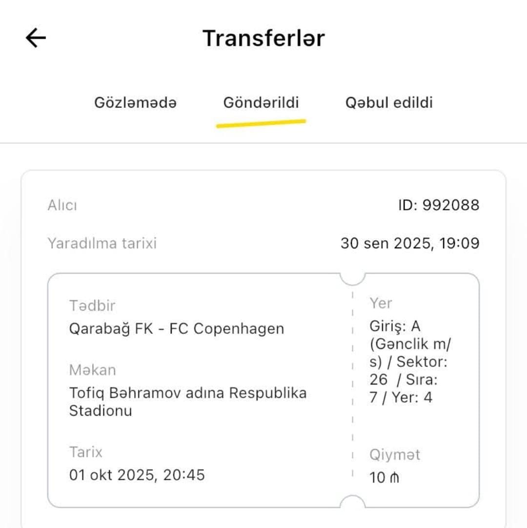 Axşam baş tutacaq “Qarabağ”ın oyununa iTicket.az-dan bilet alan müştərinin bileti özünün məlumatlı olmadan başqasına transfer edilib.