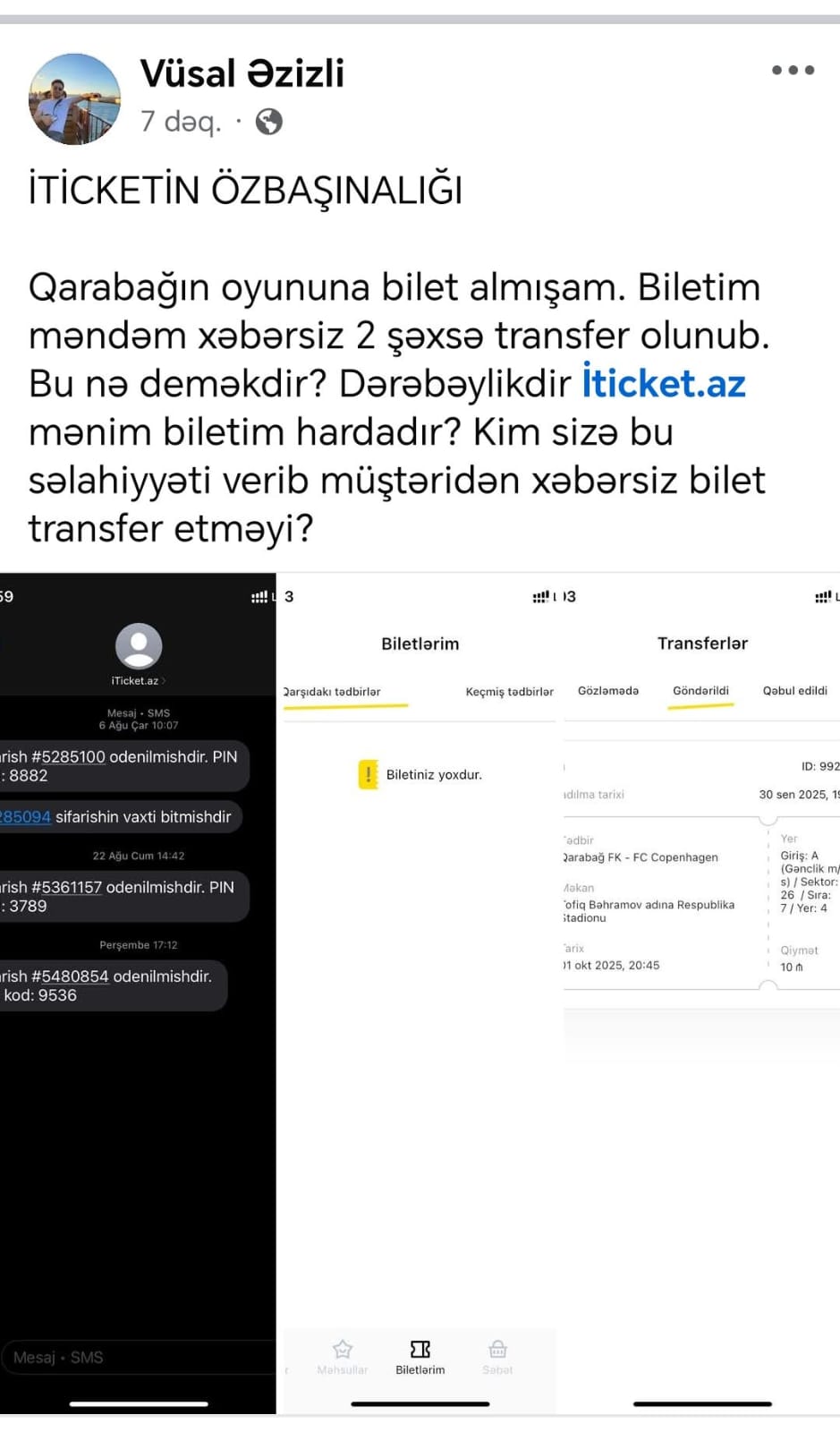 Tribunainfo.az xəbər verir ki, bu problemlə üzləşən şikayətçi Vüsal Əzizli problemini sosial şəbəkədə ictimailəşdirib. O bildirib ki, “Qarabağ”ın oyununa bilet alıb, ancaq bileti özündən xəbərsiz 2 şəxsə transfer olunub: