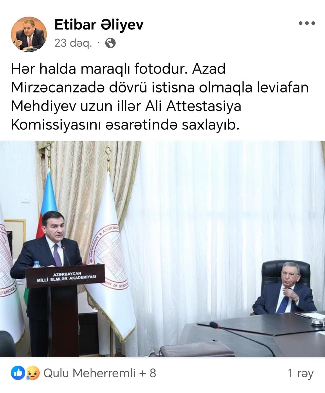 “Hər halda maraqlı fotodur. Azad Mirzəcanzadə dövrü istisna olmaqla, Mehdiyev uzun illər Ali Attestasiya Komissiyasını əsarətində saxlayıb”.